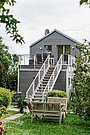 Das Rüfugium verfügt über zwei Ebenen. Im Erdgeschoss befinden sich drei Schlafzimmer und ein kleines Arbeits- und Medienzimmer. Außerdem liegt hier das großzügige Bad mit Gartenzugang sowie ein weiteres Duschbad. Über die aus massivem Eichenholz gefertigte Treppe erreichen Sie das obere Stockwerk, das durch sein lichtes Dach und die breiten Fensterfronten eine schöne Verbindung zwischen dem Blick auf das Wasser und dem Blick in den Garten herstellt. Hier können Sie sich in großer wie in kleiner Runde um die Kochinsel treffen, mit Verwandten und Freunden am langen Eichenholztisch tafeln und entspannt auf den gemütlichen und ausladenden Ledersofas den Tag und die Nacht genießen.