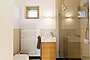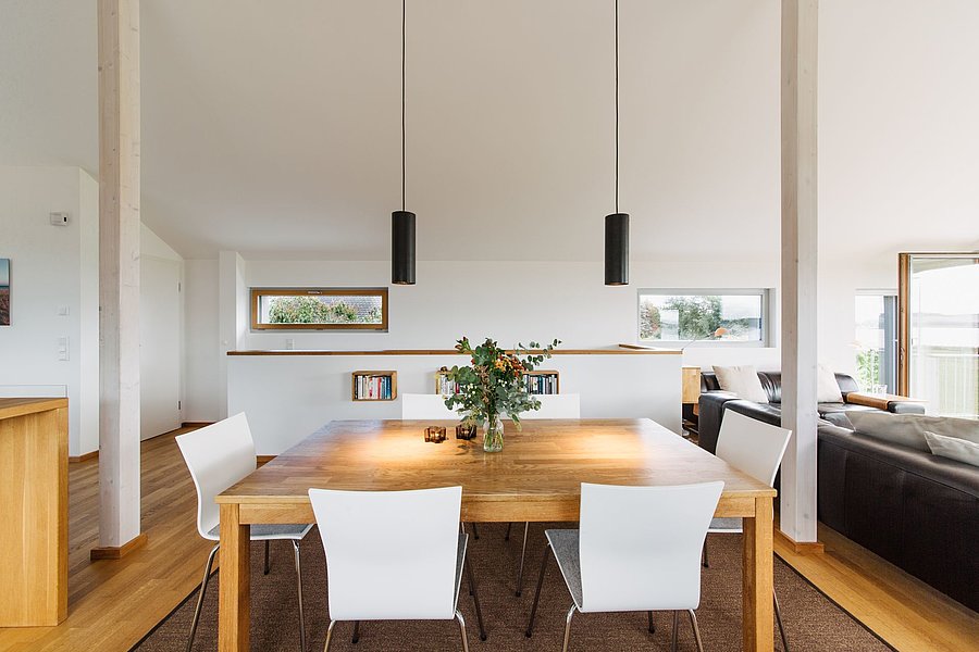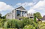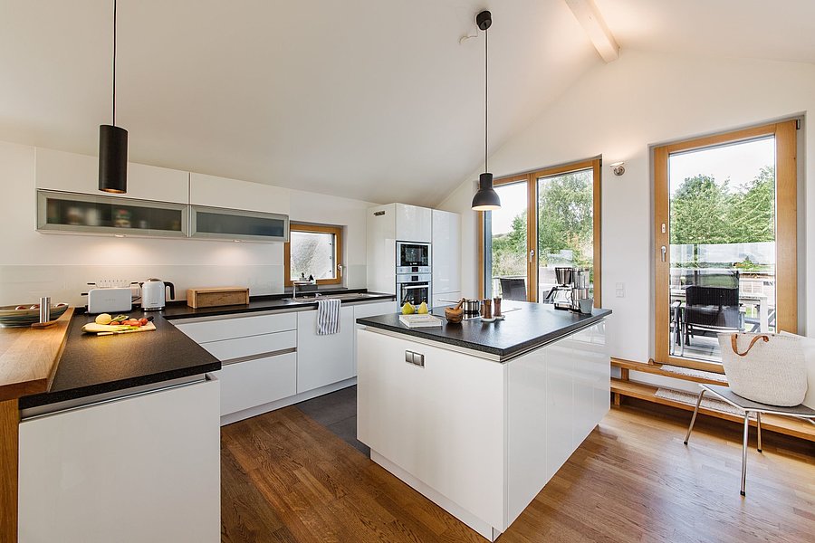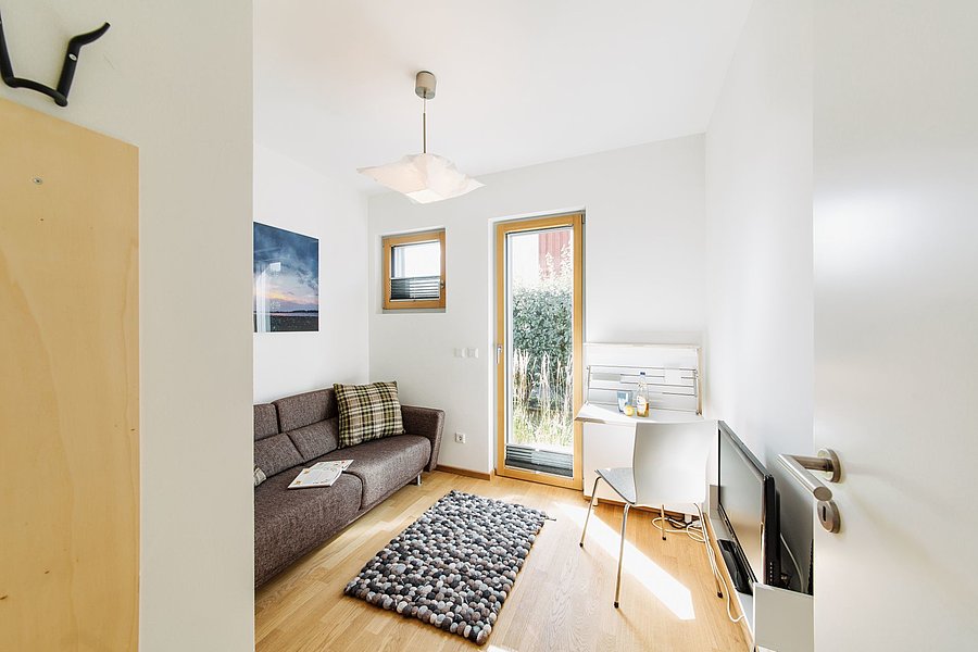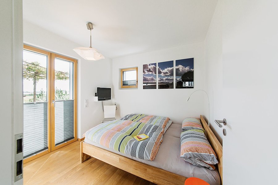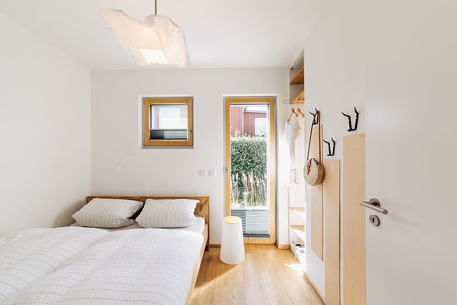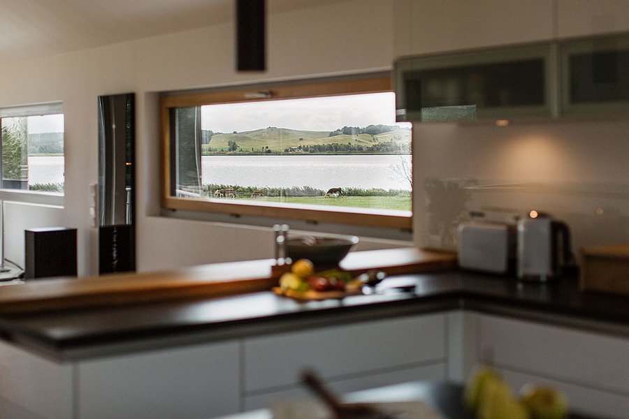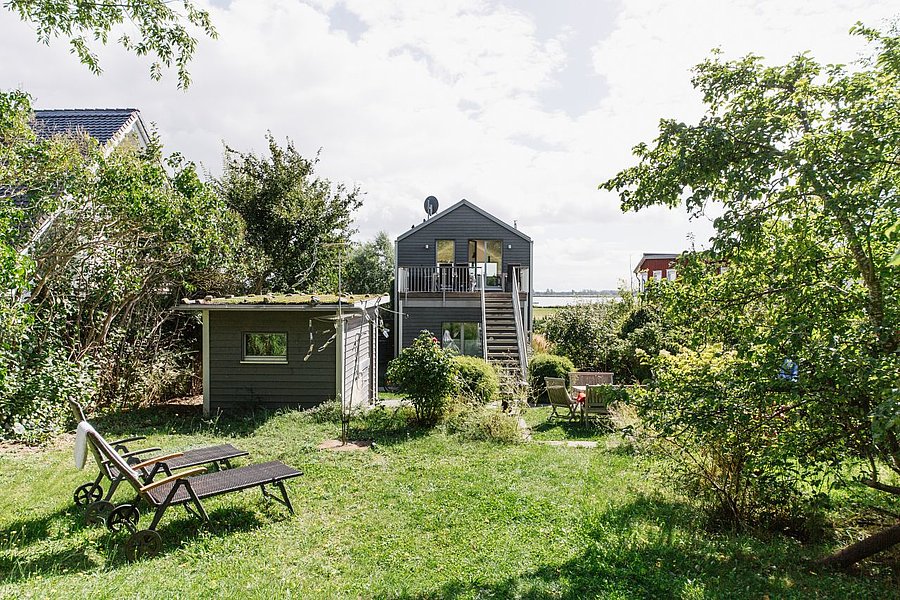 Das Rüfugium verfügt über zwei Ebenen. Im Erdgeschoss befinden sich drei Schlafzimmer und ein kleines Arbeits- und Medienzimmer. Außerdem liegt hier das großzügige Bad mit Gartenzugang sowie ein weiteres Duschbad. Über die aus massivem Eichenholz gefertigte Treppe erreichen Sie das obere Stockwerk, das durch sein lichtes Dach und die breiten Fensterfronten eine schöne Verbindung zwischen dem Blick auf das Wasser und dem Blick in den Garten herstellt. Hier können Sie sich in großer wie in kleiner Runde um die Kochinsel treffen, mit Verwandten und Freunden am langen Eichenholztisch tafeln und entspannt auf den gemütlichen und ausladenden Ledersofas den Tag und die Nacht genießen.