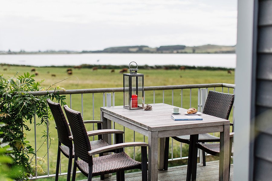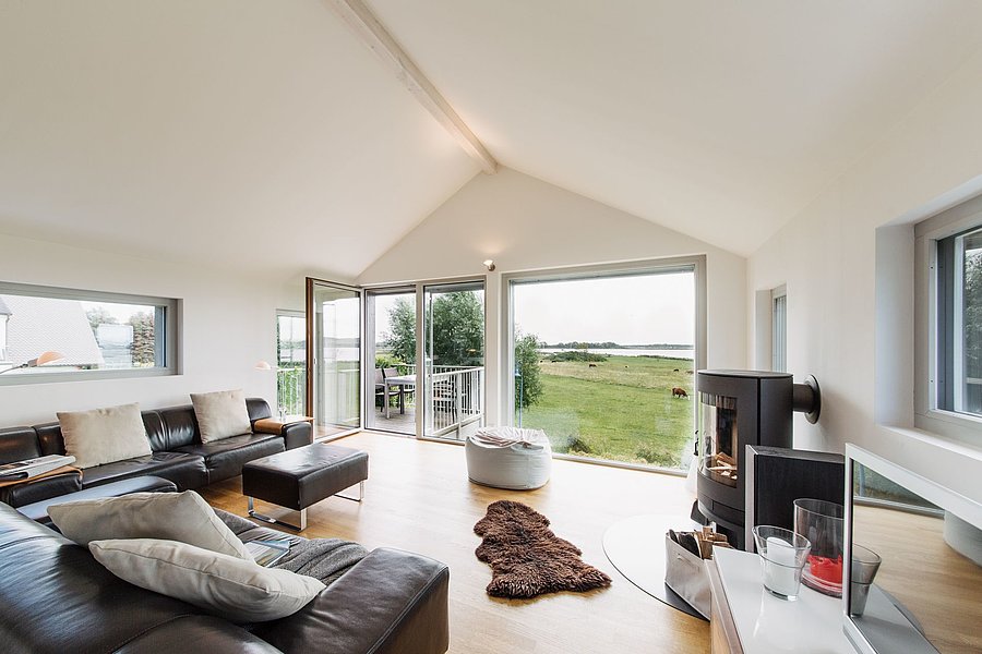 Genießen Sie auf einer der drei Terrassen oder in den Gartensofas des großzügigen Lounge-Bereichs mitten in dem parkähnlichen Grundstück den ganzen Tag die Sonne. Bei kalter Witterung sitzen Sie vor dem knisternden Kaminofen oder entspannen sich in der schönen Außensauna. Immer blicken Sie in den unterschiedlichsten Perspektiven auf das Wasser und in den Himmel.